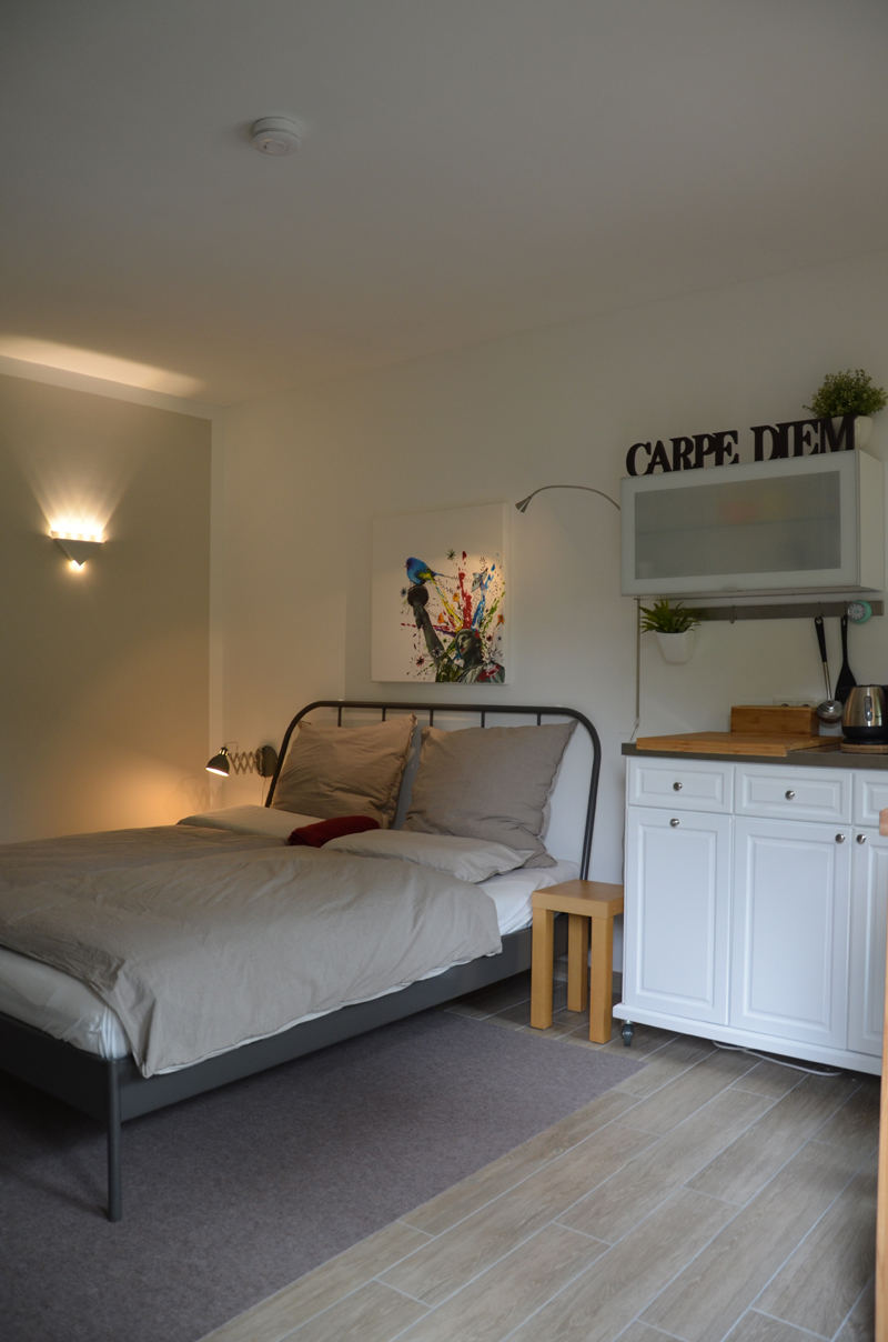 Beim Bau des Appartements und bei der Inneneinrichtung haben wir stets darauf geachtet, dass möglichst hochwertige, schadstofffreie Materialien verwendet werden: umweltfreundliche Lacke & Farben (blauer Engel), Kissen, Decken & Matratze (schadstofffrei nach Öko-tex Standart 100), Fliesen als Bodenbelag.